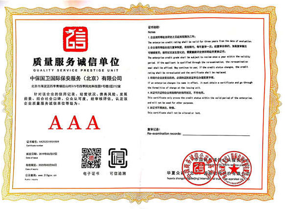 中保國衛(wèi)國際保安服務(wù)(北京)有限公司,屬中保國衛(wèi)集團旗下子公司。能全方位的為大型客戶提供優(yōu)質(zhì)的安保、押運服務(wù),是集人防和技防于一體的新型正規(guī)化綜合安保押運服務(wù)企業(yè),提供人防、物防、技防、聯(lián)網(wǎng)報*、非武裝押運等安防相關(guān)的一站式服務(wù)。 公司在國內(nèi)多省設(shè)立有分公司及分支機構(gòu),著重提升安全押運、智能技術(shù)押運及安全技術(shù)防范相關(guān)的服務(wù),業(yè)務(wù)范圍覆蓋全國一、二線城市、港澳地區(qū)以及海外地區(qū)。安保方面主要為政府機構(gòu)、金融機構(gòu)、企事業(yè)單位、醫(yī)療衛(wèi)生、高等院校、工業(yè)園區(qū)、大型商場、高檔住宅、智能商務(wù)樓、大型活動提供門衛(wèi)、守護、巡邏、押運(非武裝)、安全檢查、保安特勤、私人護衛(wèi)、消防中控、安全技術(shù)防范、遠洋護航等全方位服務(wù),同時面向國際市場,為中資企業(yè)在“一帶一路”沿線國家投資提供境外安保服務(wù)。 >> 更多內(nèi)容 |